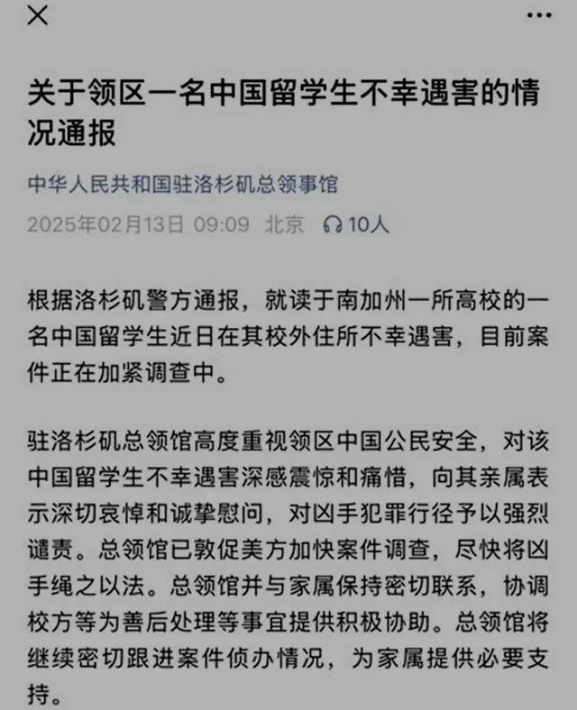 2025年2月13日,中国驻洛杉矶总领事馆发布通报称,别称就读于好意思国加州艺术学院的23岁中国女留学生庄梦涵(音译)在其校外公寓糟糕牵缠。庄梦涵是该校大四学生,她的遗体于2月4日被洛杉矶警方在进行福利搜检时发现。据警方夸耀,庄梦涵身上有多处伤疤,死因被详情为他杀。